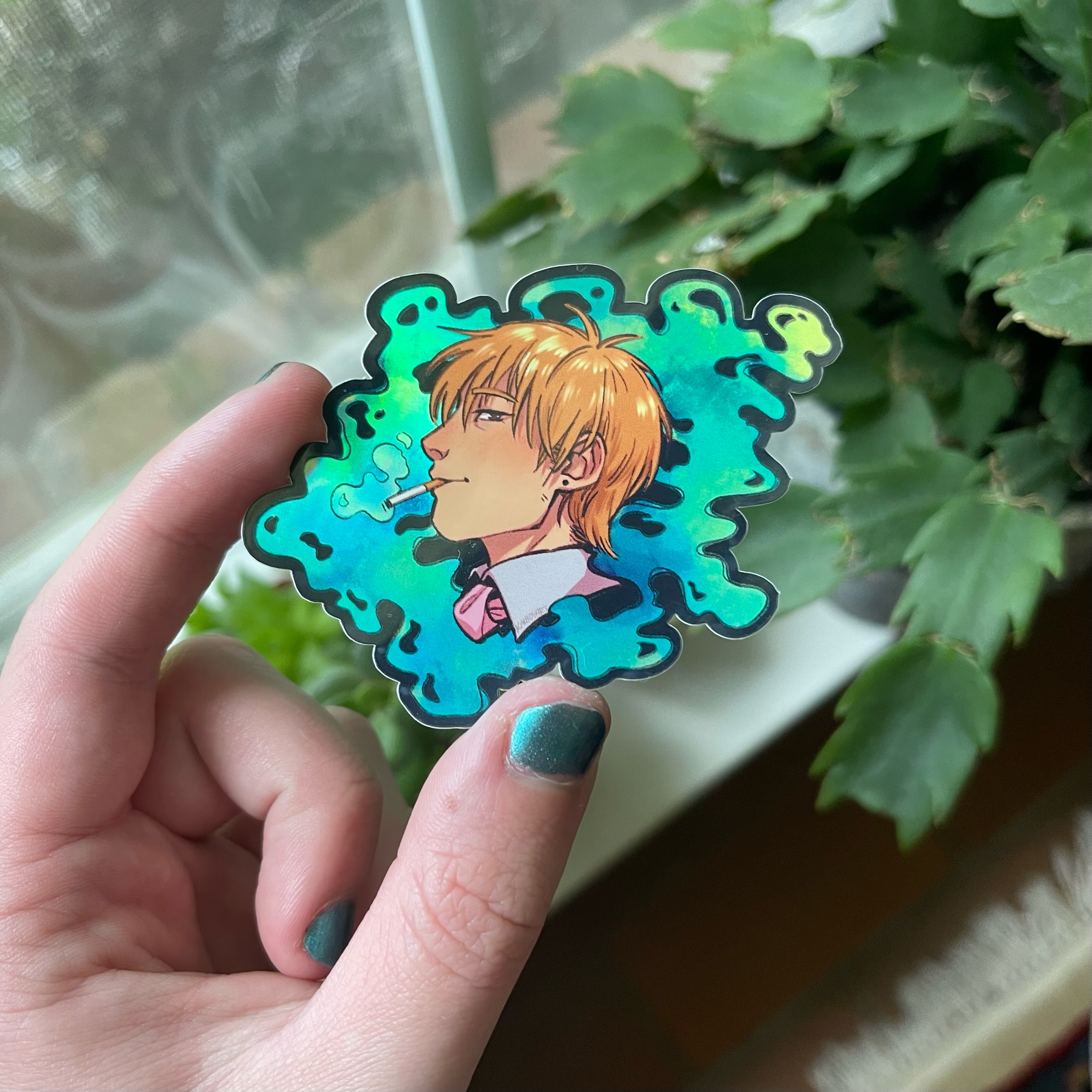 High-quality waterproof holographic vinyl sticker. Very shiny and fun to look at. Will last on your water bottle or sketchbook for a long time. 2.6 x 2.5 inches.