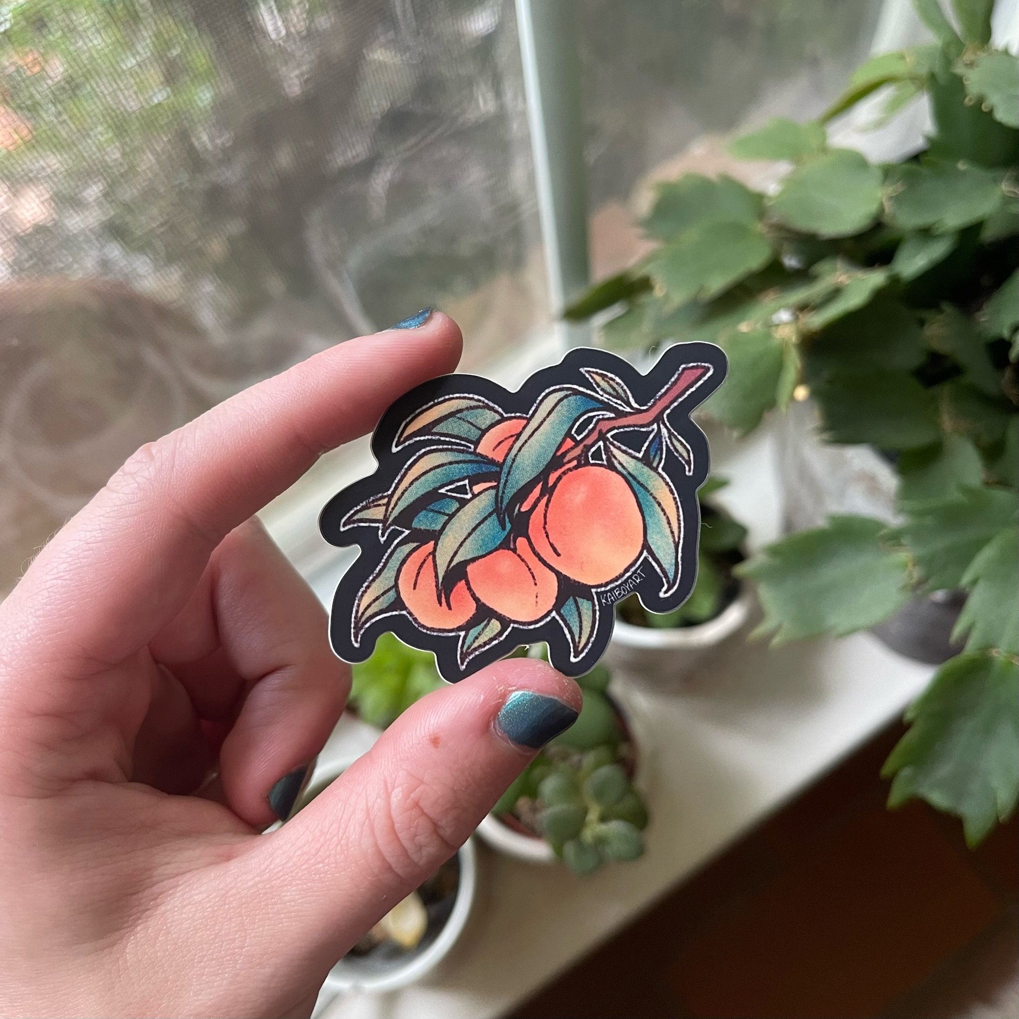 High-quality waterproof matte vinyl sticker. Will last on your water bottle or sketchbook for a long time. Has a nice texture, in my personal opinion. 2.2 x 2 inches.