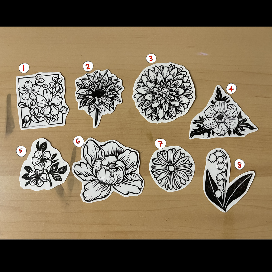 Handmade linocut print stickers. Printed on sticker paper with protective film. Each print is slightly different and may have minor imperfections. These are NOT waterproof and are less durable than vinyl stickers, so treat them with more care. Works best on flat surfaces, and probably isn't the best choice for a water bottle or frequently handled surface. B-grade stickers have larger imperfections in the print or cut line. B-grade stickers are randomly chosen from this set only.
