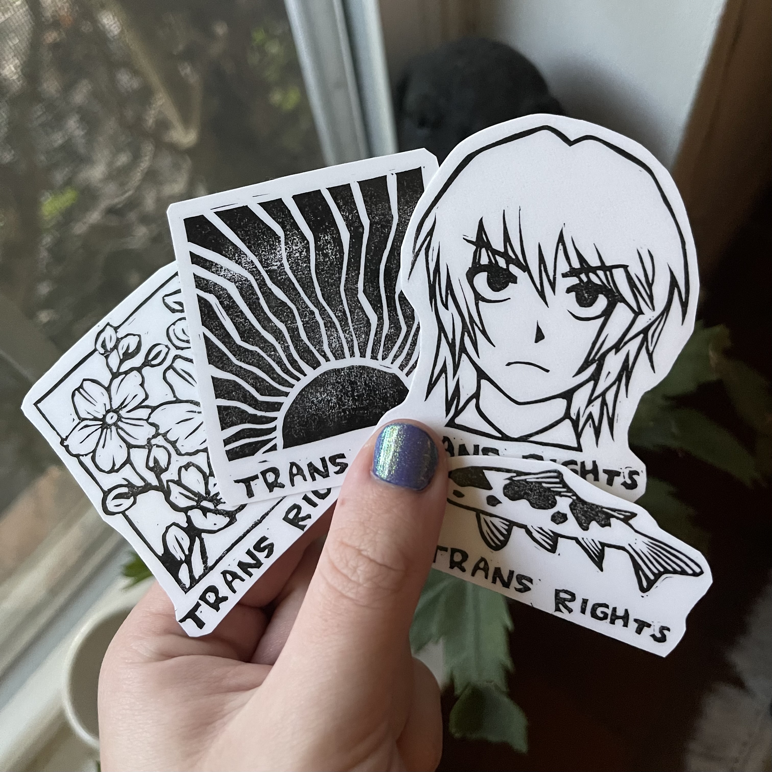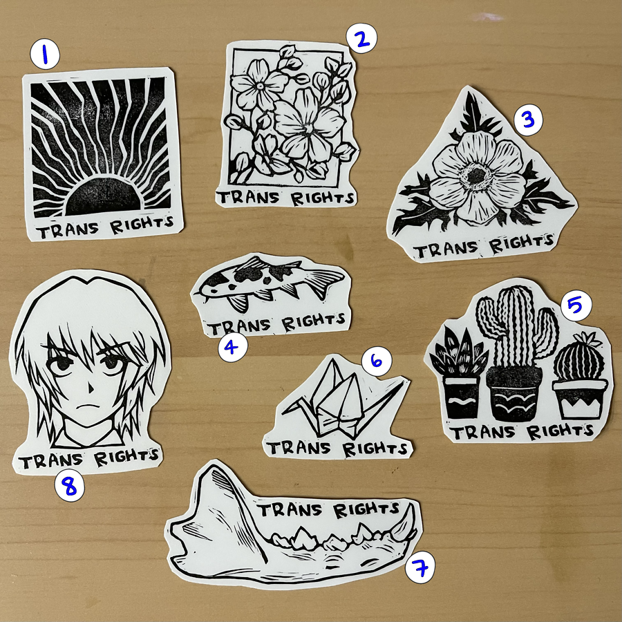 Handmade linocut print stickers. Printed on sticker paper with protective film. Each print is slightly different and may have minor imperfections. These are NOT waterproof and are less durable than vinyl stickers, so treat them with more care. Works best on flat surfaces, and probably isn't the best choice for a water bottle or frequently handled surface. B-grade stickers have larger imperfections in the print or cut line. B-grade stickers are randomly chosen from this set only.